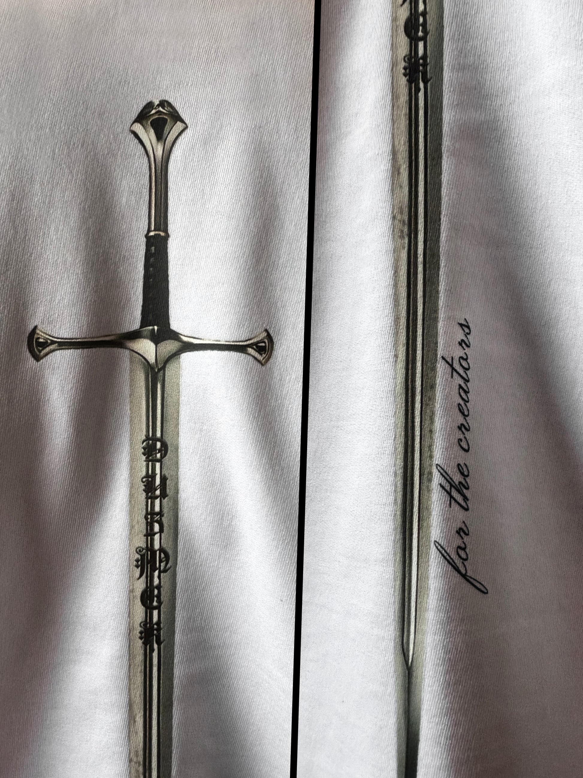 On the back, a meticulously detailed longsword stands tall — a timeless emblem of honor, strength, and artistry. Inscribed subtly along the blade, the words "for the creators" pay tribute to the dreamers, innovators, and visionaries who carve their own path.