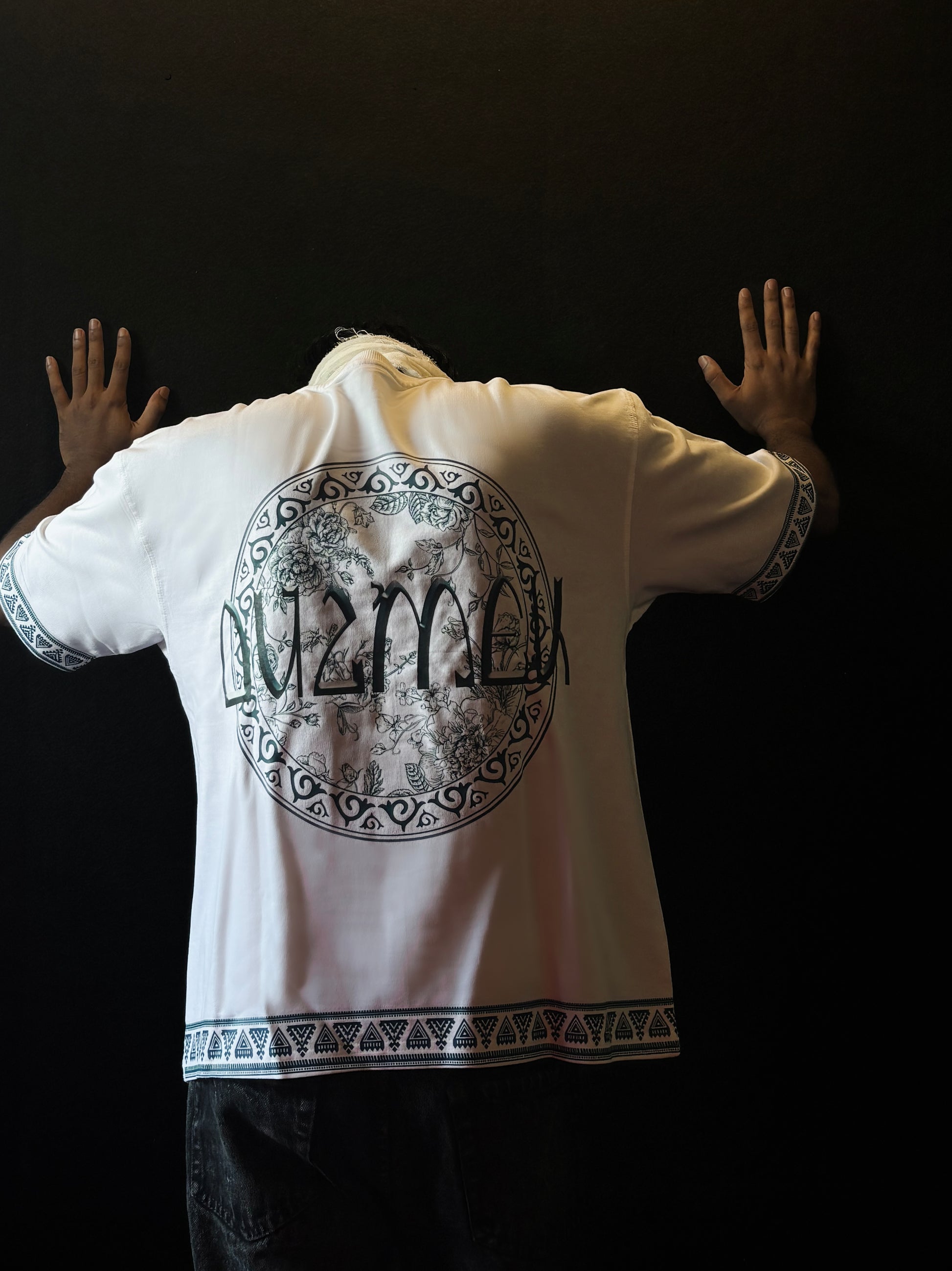 A fusion of streetwear and fine art, this T-shirt features intricate floral motifs, bold “DUZMEK” typography, and ornate borders inspired by ancient craftsmanship. Every detail — from the front’s minimal tribute to creators, to the back’s striking emblem — is a testament to precision, culture, and creativity.